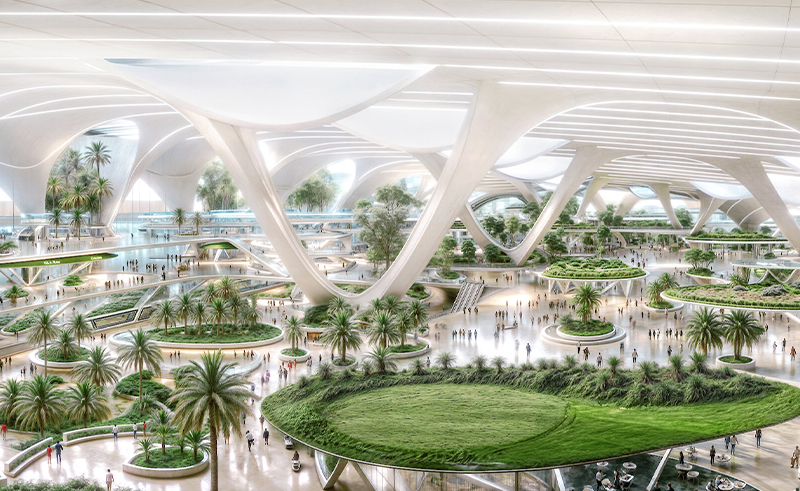 Resembling a sand dune or a gentle wave, the airport’s flowing roof defines its design, seamlessly merging form and function. Advanced structural systems allow the roof to span vast distances with minimal floor-level obstructions, creating an open, streamlined interior. This thoughtful approach ensures both aesthetic elegance and optimal functionality, enhancing the passenger experience while meeting all operational requirements.