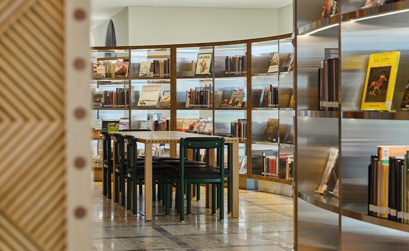 In the Equestrian Library, curved steel shelving establishes a continuous rhythm. Conceived as a space to be navigated slowly, the library unfolds like a promenade, encouraging browsing and pause. The shelves organise books and archival material while shaping circulation and defining the atmosphere of the room. Wooden elements, including oak and mahogany, introduce warmth and texture, while smaller reading nooks create moments of enclosure within the larger volume. The space supports focused study and informal exchange through its measured structure.