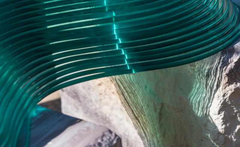 Further along, 'When the Nile Takes Shape', realised in collaboration with Dr Greiche, transforms glass and stone into layered, undulating forms that trace the river’s shifting banks. Positioned in the transition space between the garden installations and the interior, the work guides visitors through a reflective moment. Talaia reflects, “We wanted visitors to feel the river’s movement through the space, to sense its fluidity and rhythm as they moved between the installations.”