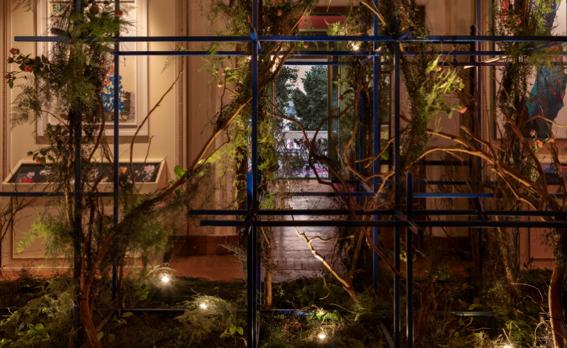 Finally, at the palace entrance, 'Intertwined Botanica', designed with Flower Bar and lit by 3 Brothers, threads greenery through the architecture. A subtle dialogue emerges between built form and greenery, as plants climb through the palace’s rigid frames with gentle persistence. It evokes Zamalek’s history of gardens and tree canopies, showing how memory and place converge and how urban life and nature can coexist in harmony. Blue structural elements echo the palace’s stained-glass windows, while climbing plants reference Zamalek’s heritage as a district defined by gardens.