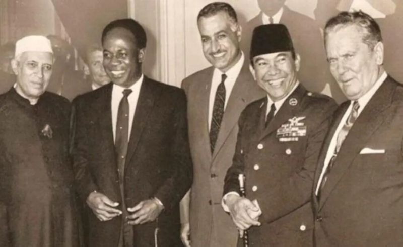 World leaders Shri Jawaharlal Nehru of India, Kwame Nkrumah of Ghana, Gamal Abdel Nasser of Egypt, Sukarno of Indonesia and Josip Broz Tito of Yugoslavia at the Bandung Conference in 1955