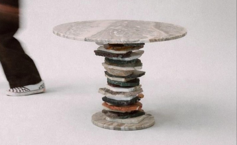 One of the brand’s earliest pieces, the ‘STAQ’D Table’, features a circular tabletop supported by irregular fragments of marble stacked on top of one another. Each piece varies in shape, colour, and size, forming a layered structure from materials that might otherwise have been discarded.