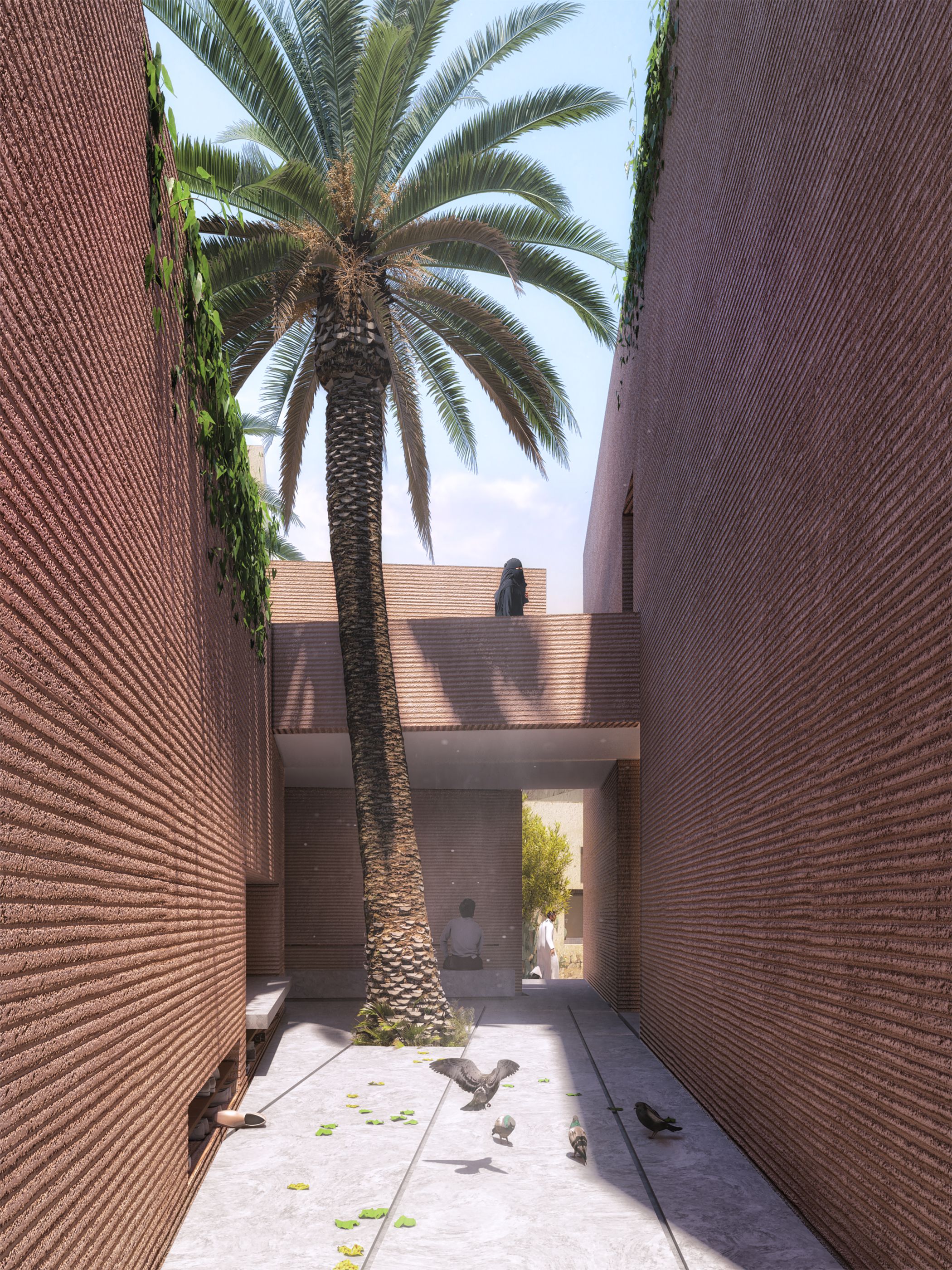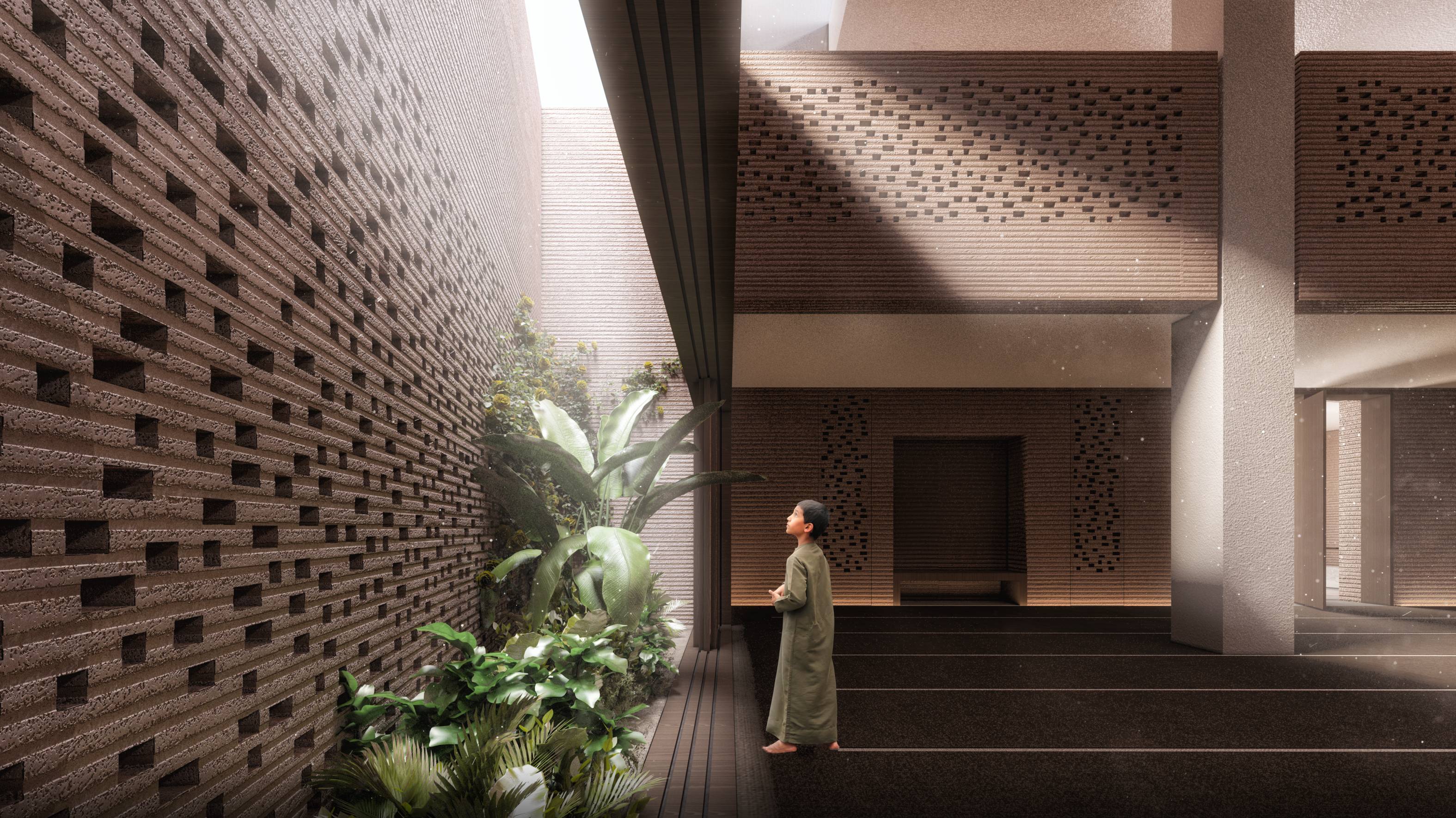 A communal space was introduced between the hall and the ablution area as a transitional courtyard. “It forms a symbolic ‘Sahn’ with a palm tree and benches underneath that offer a peaceful resting place,” Mekkawi says.