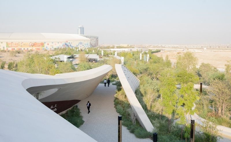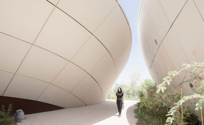 A dune-like landmark in Dubai, the Ghaf Woods Experience Centre merges architecture with forest living