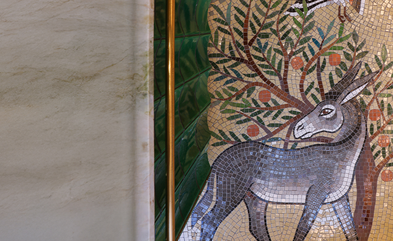 The mosaic, placed across the main floor, maps Egypt’s landmarks. Designing it required sensitivity: how to represent cultural icons without creating discomfort around the idea of stepping over sacred sites. “We went through several iterations to find the right balance,” says Hefnawy. “Each piece was simulated digitally before being placed. It’s a map, but it’s also a memory you walk on.”