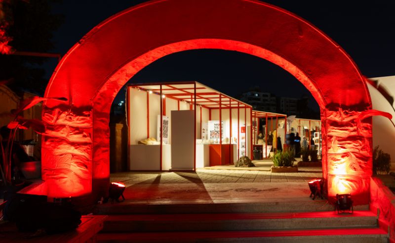 Merryland Garden has long been regarded as an urban lung and social anchor for the neighbourhood. Here, an existing restaurant structure – all wood and neutral tones – becomes the starting point for the spatial narrative. It stands in for the “past,” a state of dormancy from which new work begins to emerge. Against this backdrop, a series of crimson interventions – wooden frames, textiles, and light, modular structures – are introduced as signs of new life. The red palette operates as a visual metaphor for metamorphosis: a shedding of old skin to reveal new forms, where traces of what came before remain embedded in what follows.