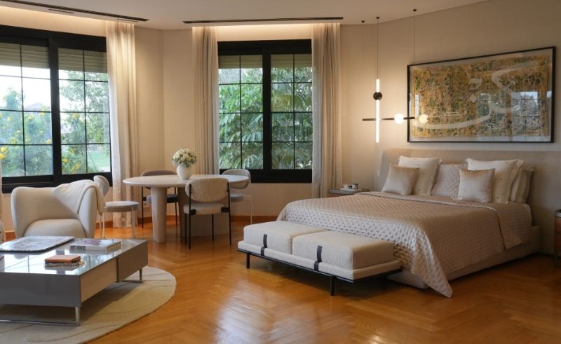 The suite includes a hidden desk that allows work to disappear when needed, and a master bathroom organised around a freestanding tub. The palette remains minimal - white with black detailing - quiet, balanced, and easy to occupy.