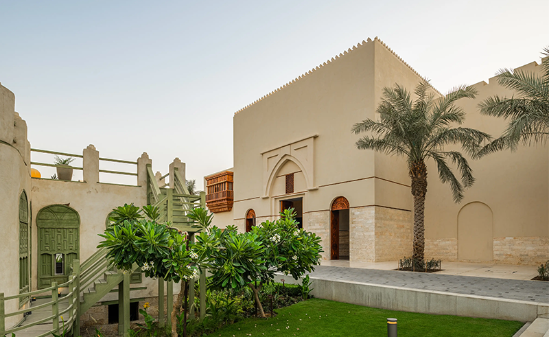 Externally, the façades balance solidity and openness through layered compositions that echo the depth and rhythm of Jeddah’s historic architecture. Handcrafted wood meets advanced fabrication techniques, creating surfaces that register shadow, scale, and proportion without pastiche. Roof terraces and overhangs provide shaded outdoor spaces, extending the public realm vertically and offering panoramic views of the lagoon and the historic city.