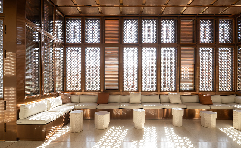 Inside, the roshan appears in copper, catching natural light to produce shifting tones as the day progresses. The material introduces warmth while remaining precise and controlled, carrying craft traditions into a contemporary context. Interior surfaces are paired with neutral stone and polished concrete, creating a calm backdrop that accentuates the copper’s reflective quality.
