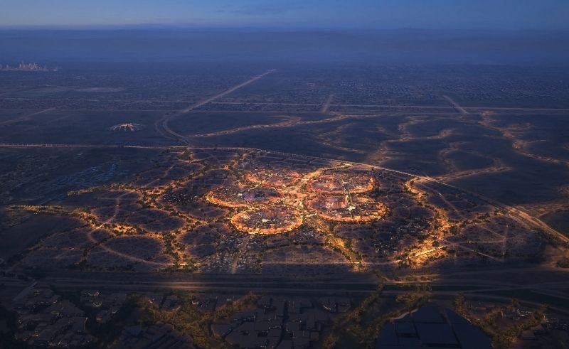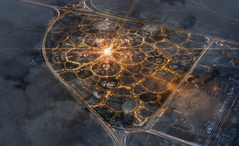 The design rejects the conventional grid, drawing instead on the seasonal rivers and wadis of Saudi Arabia’s desert terrain. These natural systems create the shape of five petal-like districts gathered around a central riverbed, linked by bridges that foster connectivity and walkability.