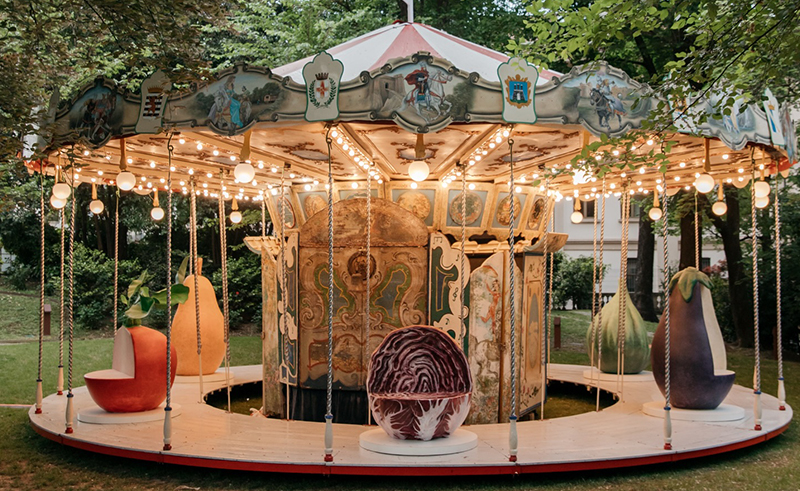Set within Giardino delle Arti during Milan Design Week 2026, Laila Gohar’s collaboration with ARKET reimagines one of Italy’s oldest 18th-century carousels. Taking over the historic structure, the installation replaces traditional horses with oversized fruit and vegetable forms that visitors can ride, turning a familiar object into something unexpected.