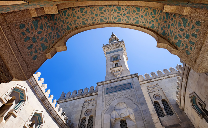 Designed by Italian-Egyptian architect Mario Rossi, the centre and its mosque follow Rossi’s ‘Neo-mamluk’ adaptation of Mamluk Egyptian style which he applied in Cairo and Alexandria during the 1940s. Meanwhile, the interior features multinational beauty. Tranches of the mosque’s walls and its mihrab are covered with bright, blue and floral ceramic tiles which anchor the space with Ottoman aesthetics. They were gifted from Turkey while the bronze chandeliers were from Egypt and the ceiling they hang from was adorned with Quranic verses handcarved by Egyptian craftsmen as the floors were concealed with Persian rugs.