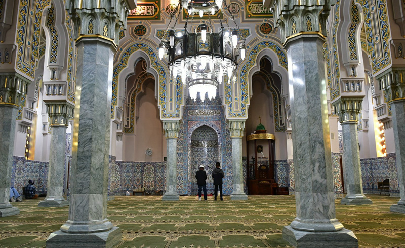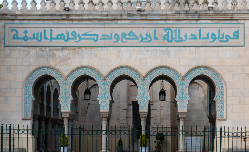 Today, flags of Islamic nations are arrayed around the building complex which is oriented towards the streets. The mosque, on the other hand, is rotated to face Mecca. Rossi’s building plan featured a three-Iwan hall encircled by a double-riwaq arcade which separates the complex from the street through five horseshoe arches.