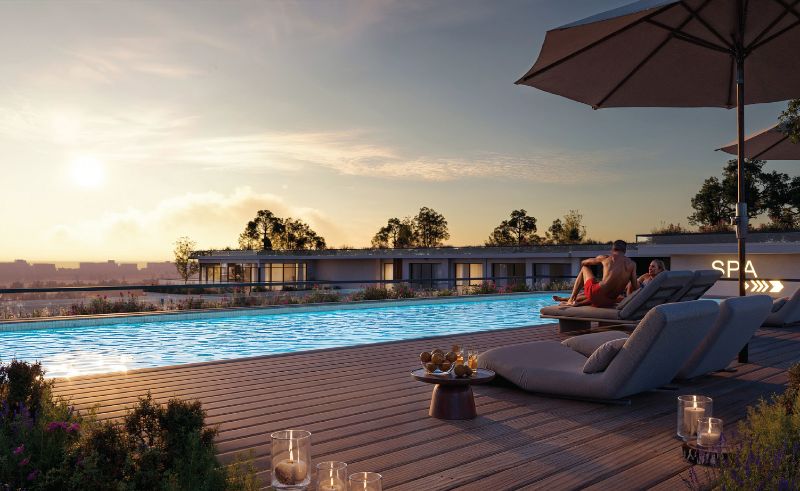 At its highest level, a sequence of rooftop wellness spaces completes the journey—pools, lounges, and shaded decks aligned with the skyline. These upper terraces reintroduce calm and perspective, allowing the design to conclude not with enclosure but release.