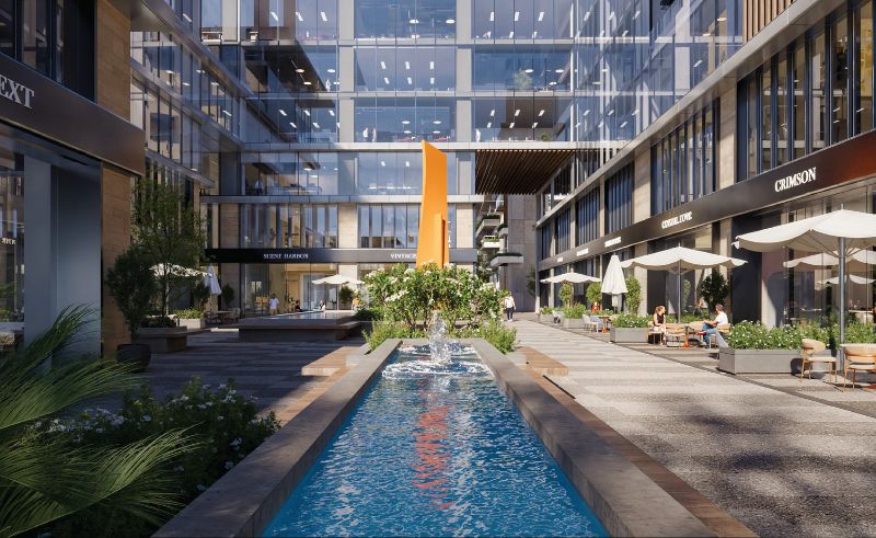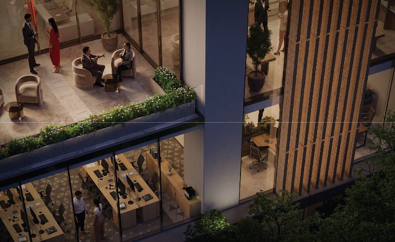Residences rise above a base of retail and offices, connected through landscaped terraces and rooftop wellness decks that soften the threshold between public and private realms. This spatial layering transforms the building into an active urban organism, animated throughout the day by shifting rhythms of use.