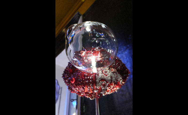 The mouth is made up of small fragments of material coming together hues of bold red and bright pink. It blows a bubble of glass holding light; an image that ‘does not whisper, but declares.’