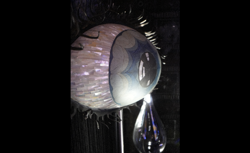 The eye remains open as a quiet glass tear hangs from its corner. ‘The tear is not sorrow but memory made visible,’ illuminated by a single bulb.
