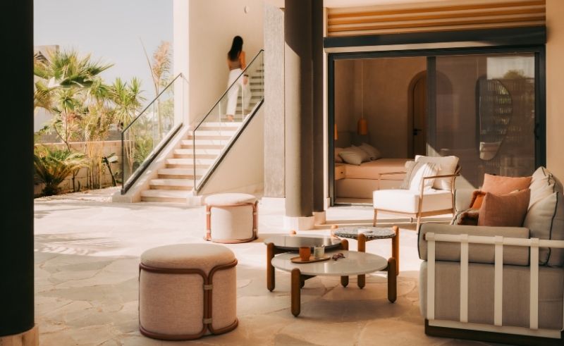 The villa’s architecture extends seamlessly into its furniture. Many pieces were designed and built as part of the structure itself, moulded in curves and softened edges. The rest were custom-made in collaboration with Modoro, who produced the beds, commodes and seating that echoed the same sculptural language. Each detail reinforces cohesion, giving the home a curated organic identity.