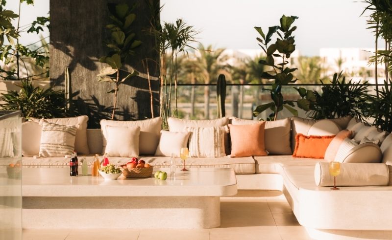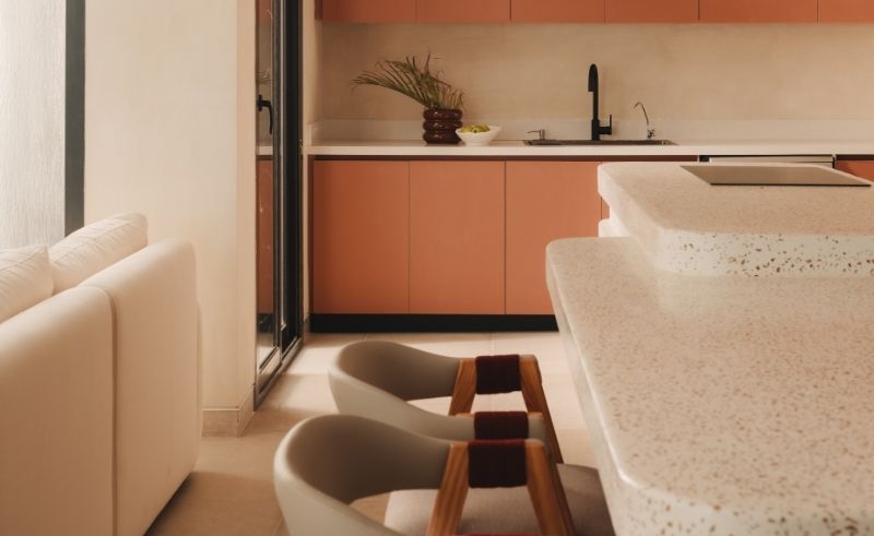 “The client wanted something breezy, beachy and fun,” Sarah Abdou, Founder and Chief Designer of Space S, tells SceneHome. “Not mellow, but earthy, with one pop of colour. In our case, it was the terracotta clay tone.” The warm shade runs throughout the villa, appearing in kitchen cabinets, accessories, art pieces and sculptural accents. Used as a thread across spaces, it energises the earthy palette and brings vibrancy to the cool summer setting.