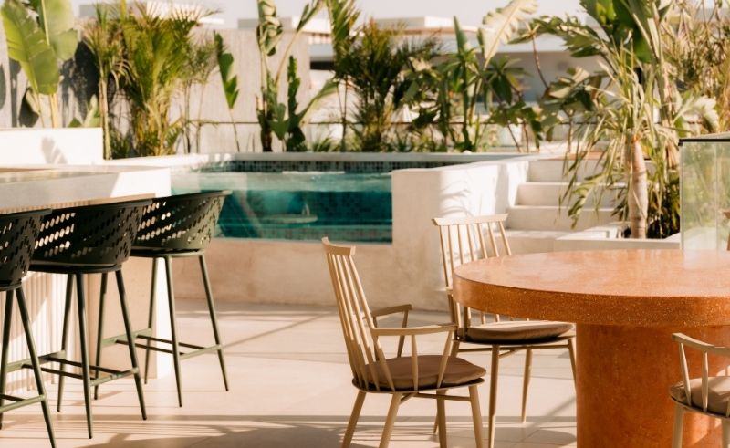 Mosaico, a material once popular in coastal Agami homes and tied to a sense of nostalgia, becomes the project’s defining medium. Revived here in a contemporary language, it forms the kitchen island, dining tables, bars, and even the outdoor shower and rooftop jacuzzi. “Most of the materials we used were formed by hand, so everything feels built into the architecture itself,” Abdou explains. The sculpted jacuzzi, with its glass side revealing the water within, becomes a playful centrepiece on the roof terrace, echoing the handcrafted shower below.