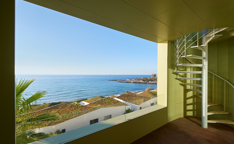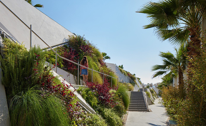 Each unit features a double-height living space opening onto a patio or roof deck, with pools integrated into the terraces to further extend the domestic space. The careful layering of volumes, shifts in height, and orientation maintain visual separation between homes while allowing them to feel connected to the wider landscape. The impact of the design lies in these cumulative choices: terraces that follow the slope, green roofs that soften the geometry, paths that frame views, and walls positioned to allow natural breezes.