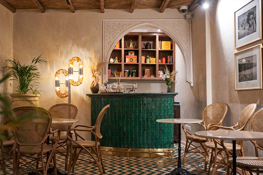 Within the bar, geometric floor patterns and parquet flooring evoke Willis’ masterful recreation of Rick’s Café from Casablanca. The smooth, hand-applied tadelakt walls are adorned with intricate zellige details, inspired by his own home. Artefacts and photos further celebrate Bill Willis’ vibrant designs and enduring legacy.