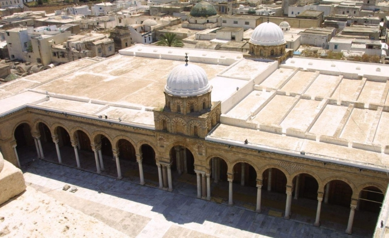 Anchoring the medina of Tunis, the Zaytuna Mosque and Madrasa trace their origins to the 8th century, rebuilt under the Aghlabids in the 9th. Its vast 5,400-square-metre plan centres on a courtyard (sahn) surrounded by arcaded galleries and a hypostyle prayer hall supported by over 160 columns—many repurposed from ancient Carthage.