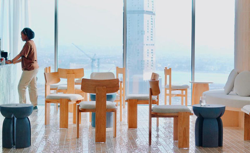 Materiality anchors this lightness. The café counter is wrapped in handmade Tiffany Zellige tiles from Morocco, each one slightly irregular and alive with reflection. Underfoot, textured orange tiles cover the raised platform, catching sunlight in ways that make the floor appear to ripple. “Since the space has a full 360 sea view, we wanted the floor to behave like the sea inside too,” Bokr explains. The same tiles climb a circular column, turning a structural necessity into a sculptural gesture.