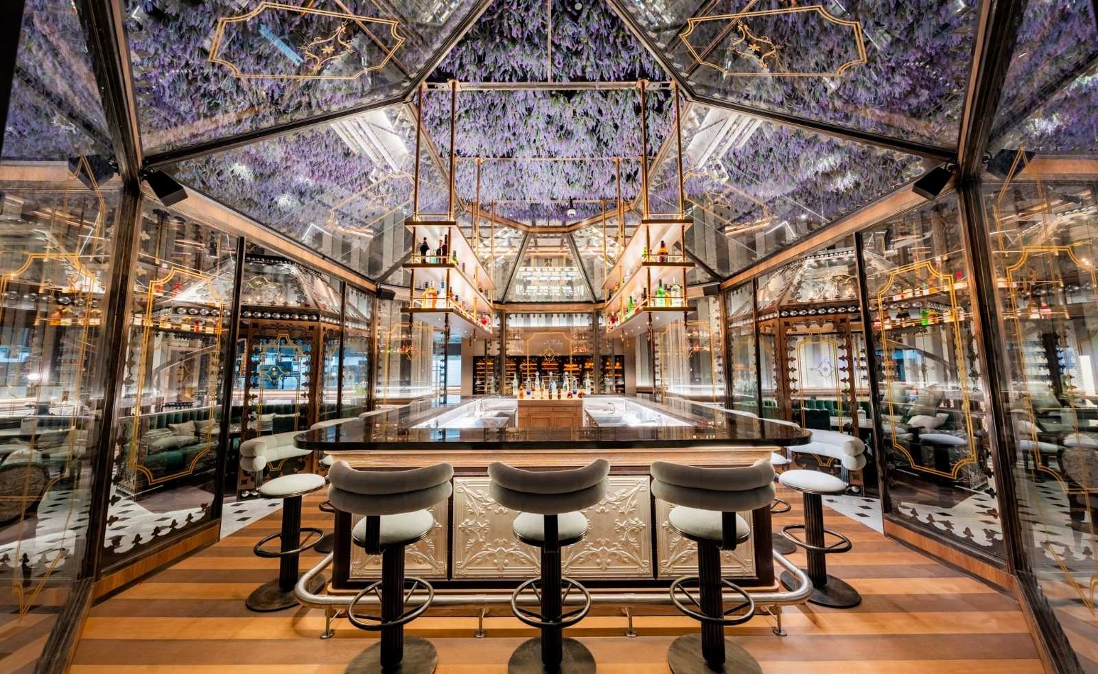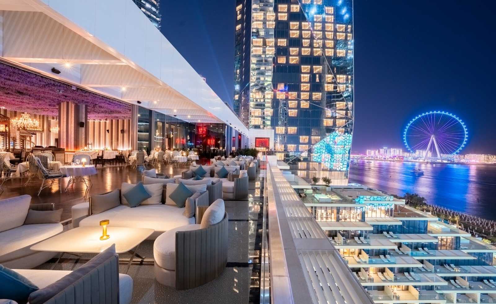 Perched on the ninth floor, the restaurant trades in refined excess, the kind that feels intentional rather than overwhelming. The menu, the music, the mood all lean into a Riviera state of mind, reinterpreted through Dubai’s love for the theatrical. From the moment you step inside, you’re greeted by a cascade of lavender-hued florals hanging dramatically overhead, framing a jewel-box bar that gleams under soft, golden light. Rococo-inspired furnishings curve and shimmer across the dining room, every detail considered, every corner designed to be seen. On a breezy evening, the terrace is where the experience truly unfolds, with Ain Dubai anchoring the skyline in slow, luminous motion.