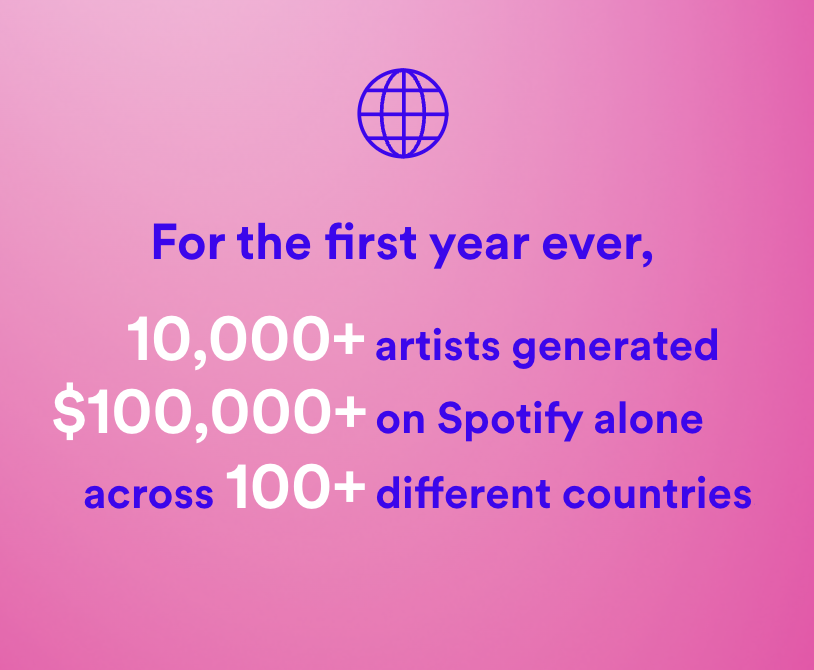 Moreover, “for the first year ever, 10,100 artists generated at least $100,000 on Spotify alone. That’s up from 4,300 artists five years ago, and due to the lowered barriers to entry, these artists hail from more than 100 different countries around the world.”