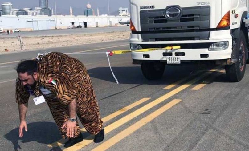 A standout strongman with an enviable hair care routine, Mahmood Shamshun-Al Arab, demonstrated extraordinary strength by pulling a 10,380 kg truck using only his hair in Fujairah on December 2nd, 2017, during UAE National Day celebrations.