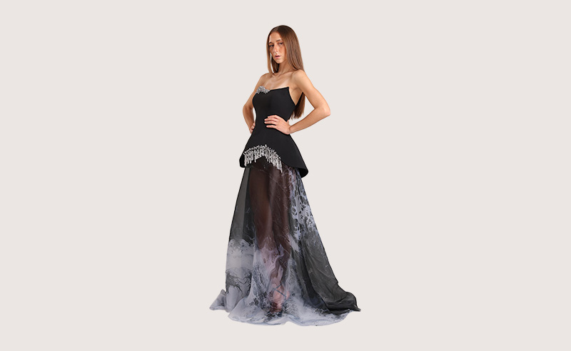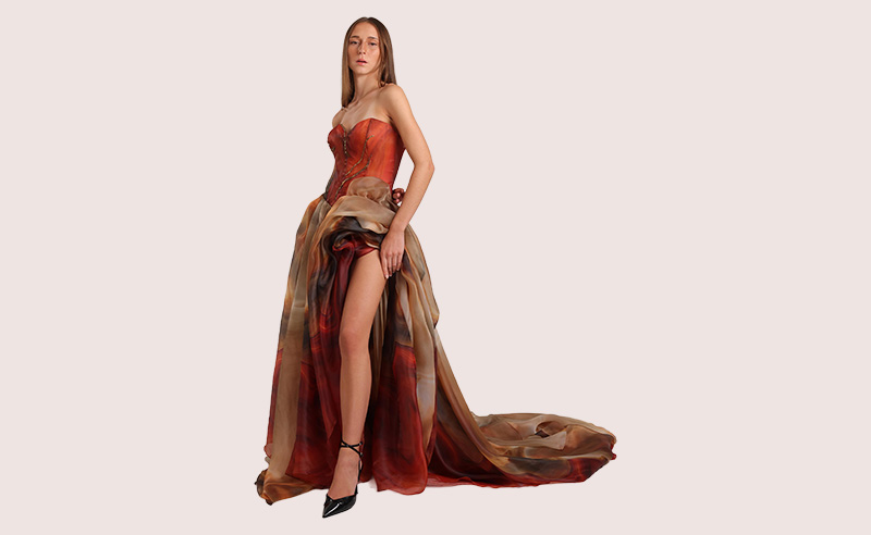 “For this print, I aimed to create a print like it’s moving while the organza flows on the runway, paired with a structured bodice with curved edges dropping crystals, I would say it’s one of my favorite pieces this collection”