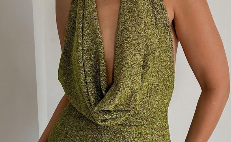 This fitted dress shimmers days on end, its fabric catching the light like a million tiny emeralds. The cascading drapes dip around the bodice for a bit of drama, while the elegant neck scarf completes the look.