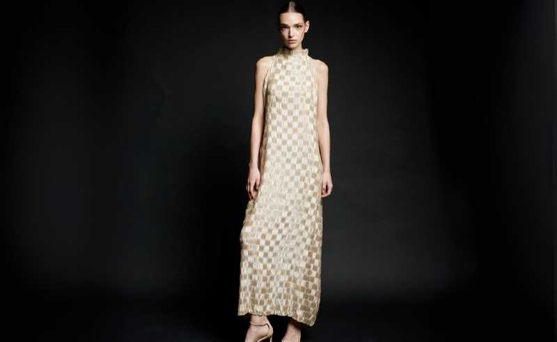 A column of quiet drama. Dima Ayad reworks White Sand into a pleated turtleneck dress that balances modesty with momentum. The checkered pattern shifts like desert mirage, understated yet hypnotic in its geometry.