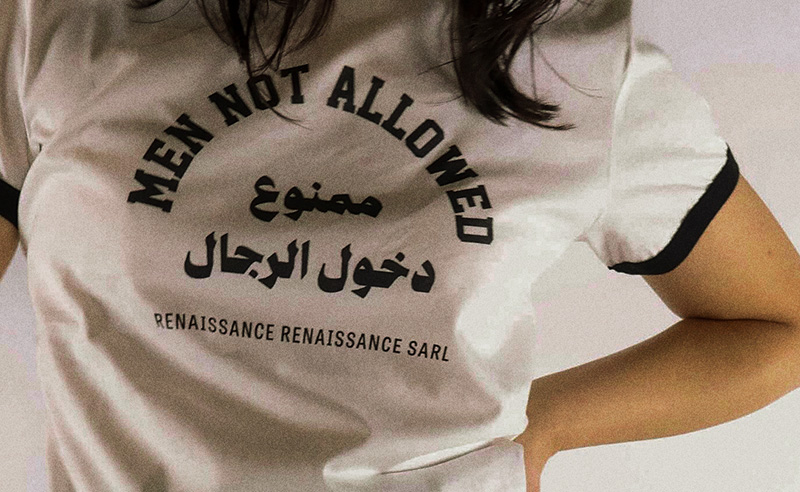 One piece has already sparked conversation, a varsity tee bearing the phrase "Men Not Allowed," printed in both English and Arabic. Merhej isn't typically drawn to text in her designs, "I don't like anything that feels too graphic," she admits, " but sometimes words can be stronger than any visual. In this case specifically, I think a lot of people almost approached it like an image in the sense it was appropriated by different communities."