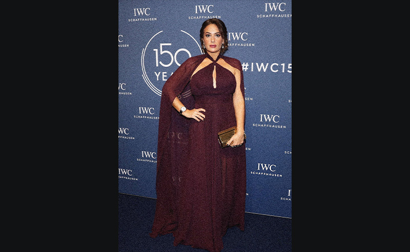 As her career shifted onto international circuits, the logic stayed intact. At the Doha Tribeca Film Festival in 2012, Sabry wore a silver-grey off-shoulder dress with sheer tulle and restrained draping. Later appearances repeat the same decisions: exposed shoulders, controlled silhouettes, minimal intervention. A beige silk bandeau layered with white lace in Geneva (2016). A black off-shoulder midi at DIFF (2017). A burgundy halter with an attached cape at IWC’s gala the following year.