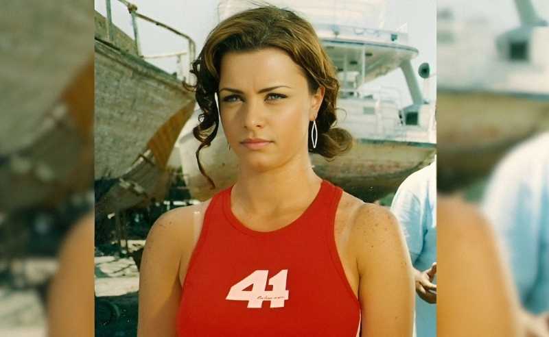 Nour’s sporty red tank, tousled curls, and sleek hoops capture effortless early-2000s cool with a quiet, confident edge.