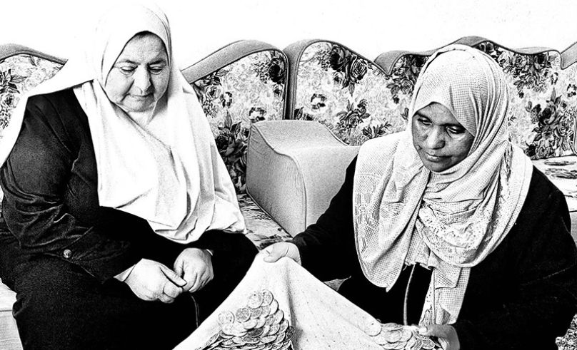 Nazzal’s process begins with archival, material and emotional research. “Each silhouette and textile is considered for its ability to convey memory, tradition, and narrative,” she explains. One of her signature pieces —a vast garment covered in coins— revives an old Palestinian custom. “It’s a tradition to adorn clothing or headpieces to protect the wearer from the evil eye,” she says. “To work with refugee women and create one giant piece full of these coins allows for cultural and historical significance while also being ethical, giving back to my community.”
