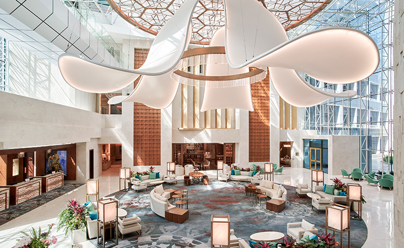 Paying tribute to the rich history that once glided along the ancient river, the hotel’s contemporary interiors feature ancient Egyptian motifs, locally inspired artworks, and a striking lobby centerpiece—an installation of draped white cloth suspended from the ceiling, a nod to the iconic Nile felucca.