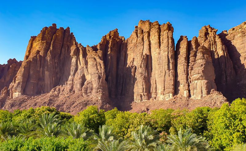In Saudi Arabia’s Tabuk region, Wadi Disah is an oasis of red cliffs, freshwater streams, and towering palms—an untouched wonder that remains one of the Kingdom’s most spectacular landscapes.