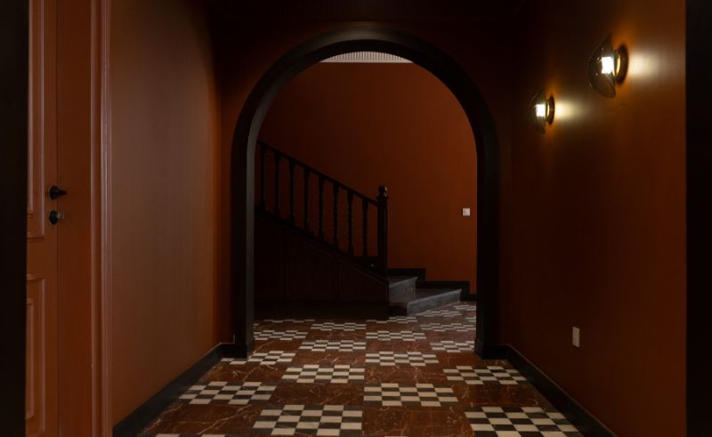From the moment you step into the lobby, the warm terracotta walls envelop you, and the polished checkerboard marble floors echo underfoot, inviting you further into the space. Large windows let in soft, natural light, offering a glimpse of the lush sprawling garden outside—a verdant sanctuary of palms, flowering shrubs, and secluded nooks designed for absolute privacy. The seating arrangements are minimal yet sculptural, with plush chairs that encourage you to sink in and relax. Wooden accents, refined and organic, balance the room’s rich textures, while the scent of fresh plants mingles with the air.