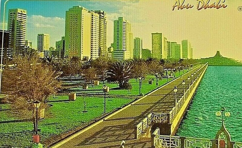 A vintage view of Abu Dhabi shows a corniche walkway over turquoise water, bordered by a green park and set against a dense skyline of towering skyscrapers.