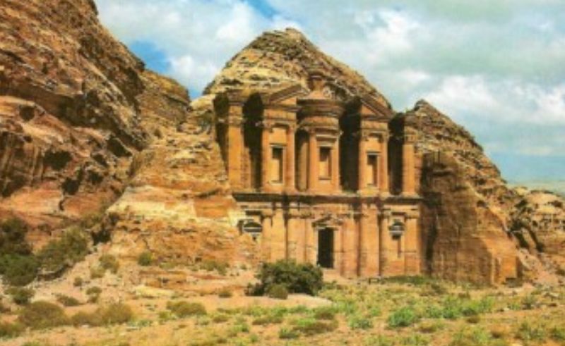 The colossal façade of Al-Deir, carved into the sheer sandstone mountain, looms over the rugged desert floor in Petra.